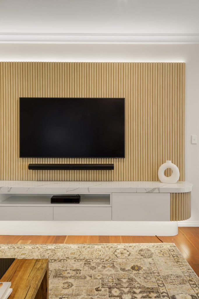 The entertainment unit – We designed and crafted a stunning 3.95-meter wide entertainment unit featuring: