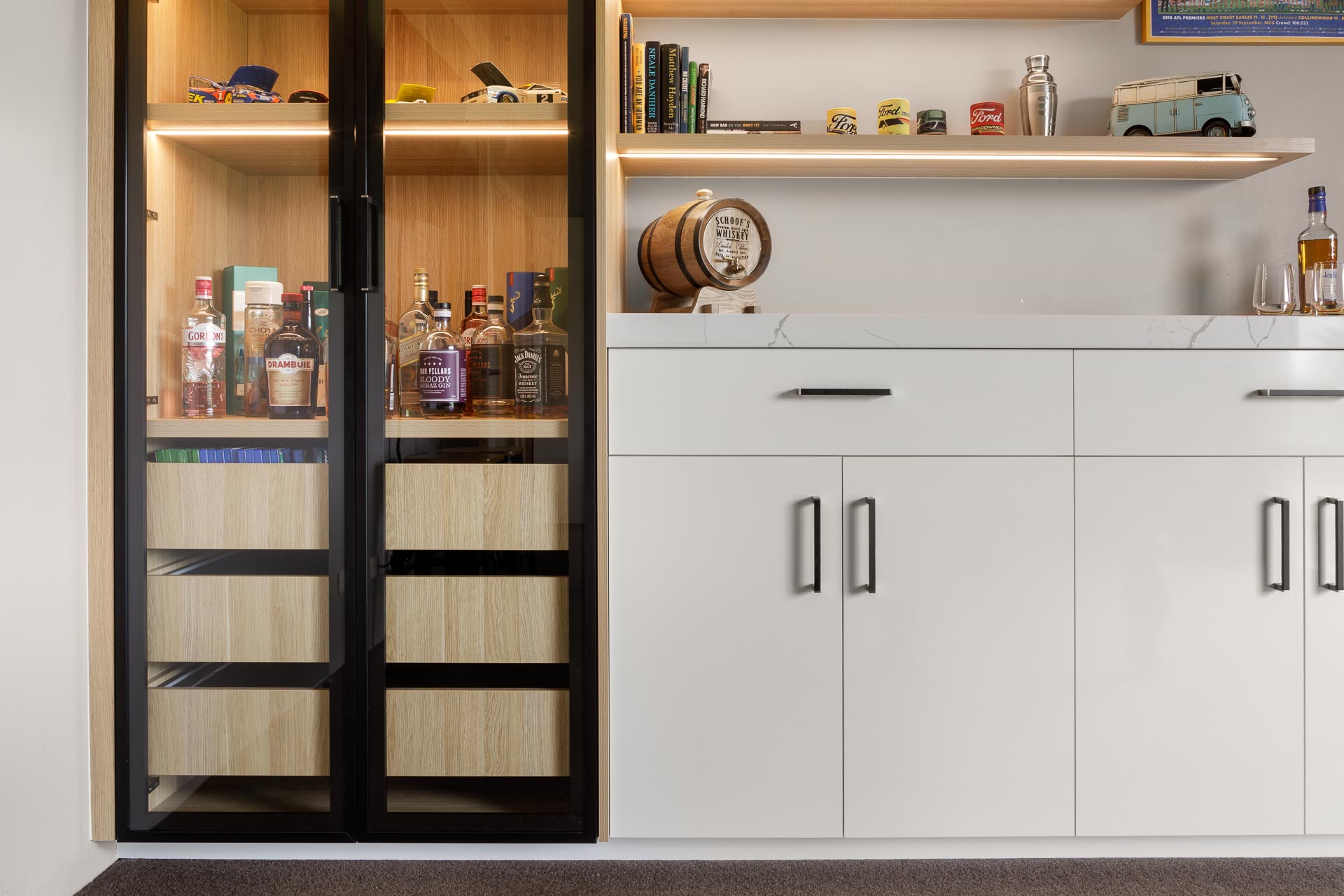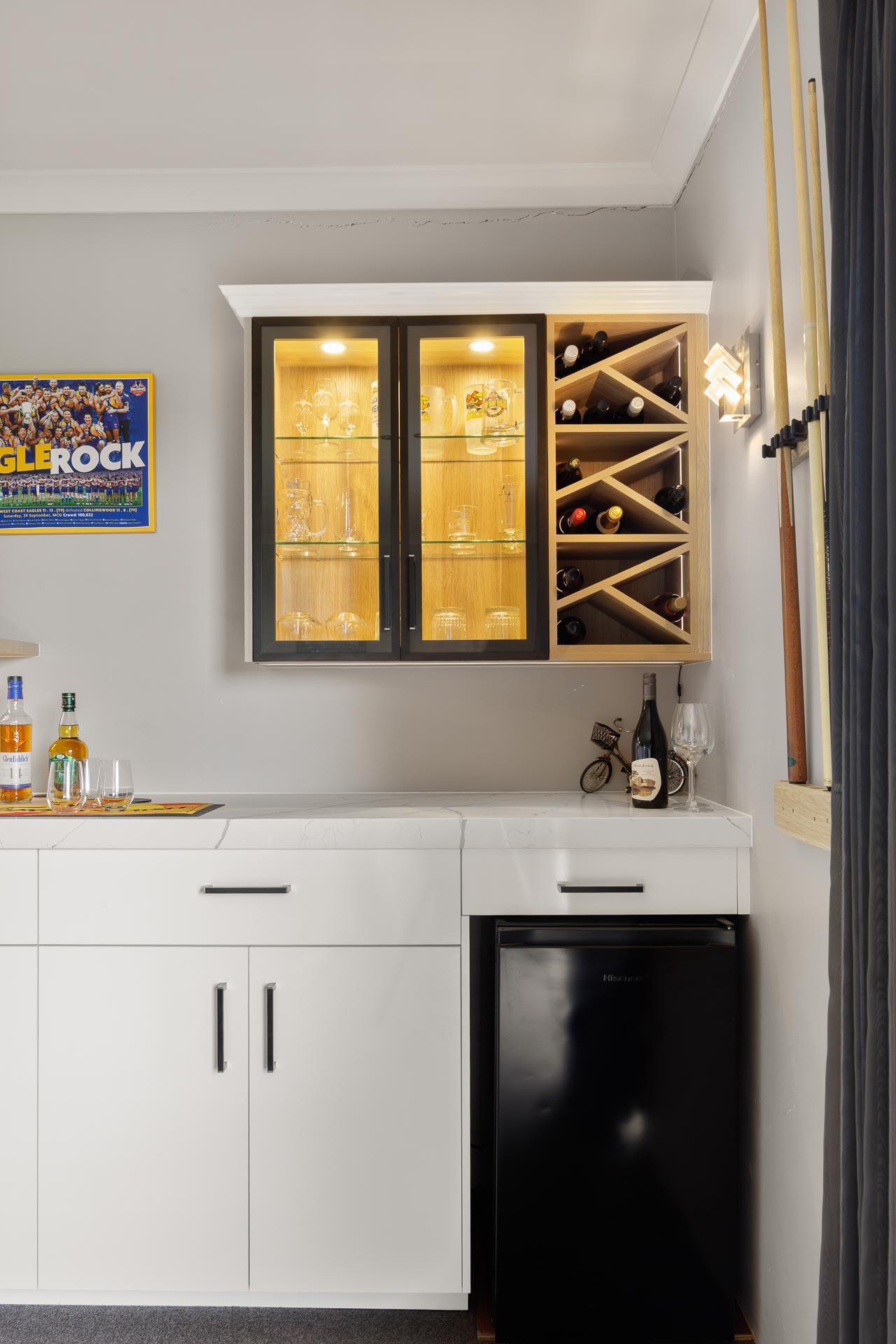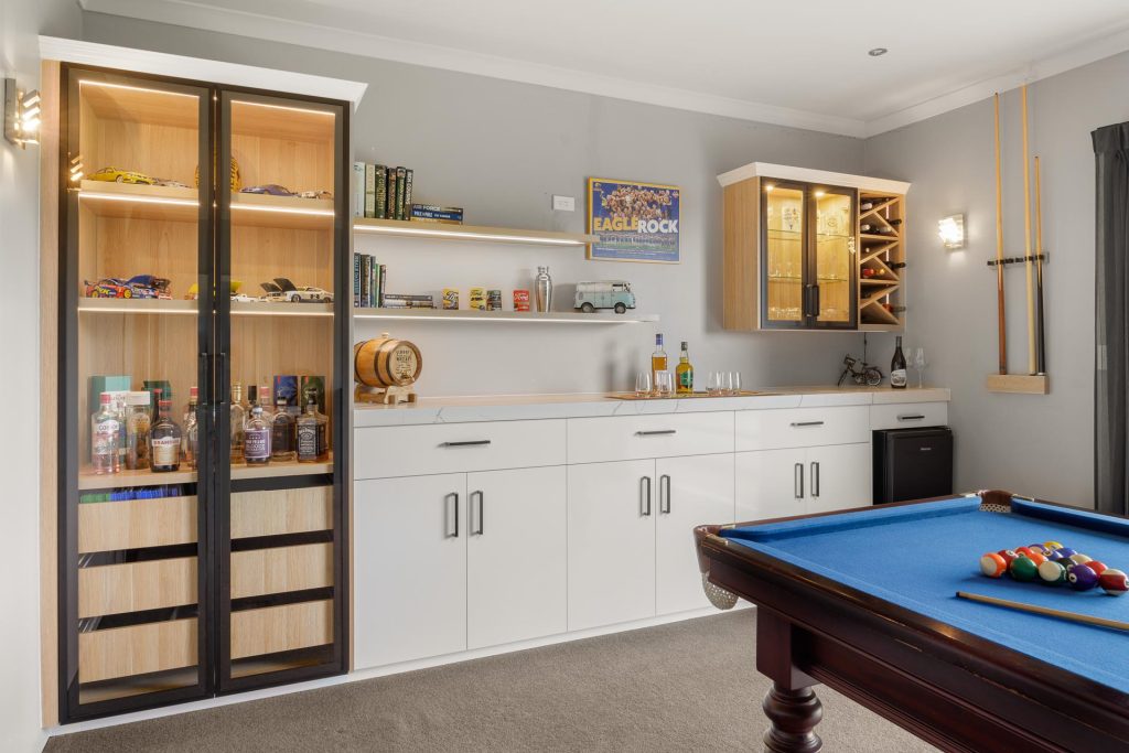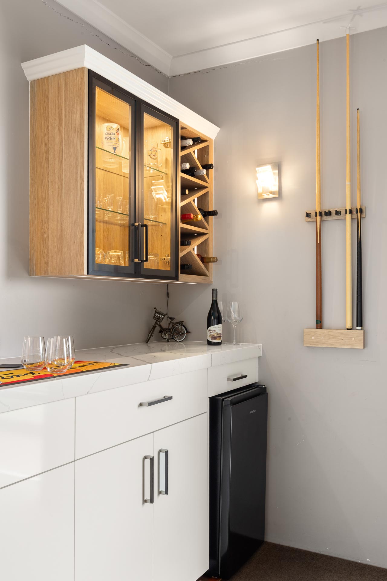 The challenge was to design custom cabinetry solutions that would seamlessly integrate with their home’s aesthetic while providing maximum functionality and storage. The entertainment unit needed to accommodate a 65″ TV and sound bar while offering concealed storage, and the games room required a full bar setup with wine storage, refrigeration space, and elegant display areas.