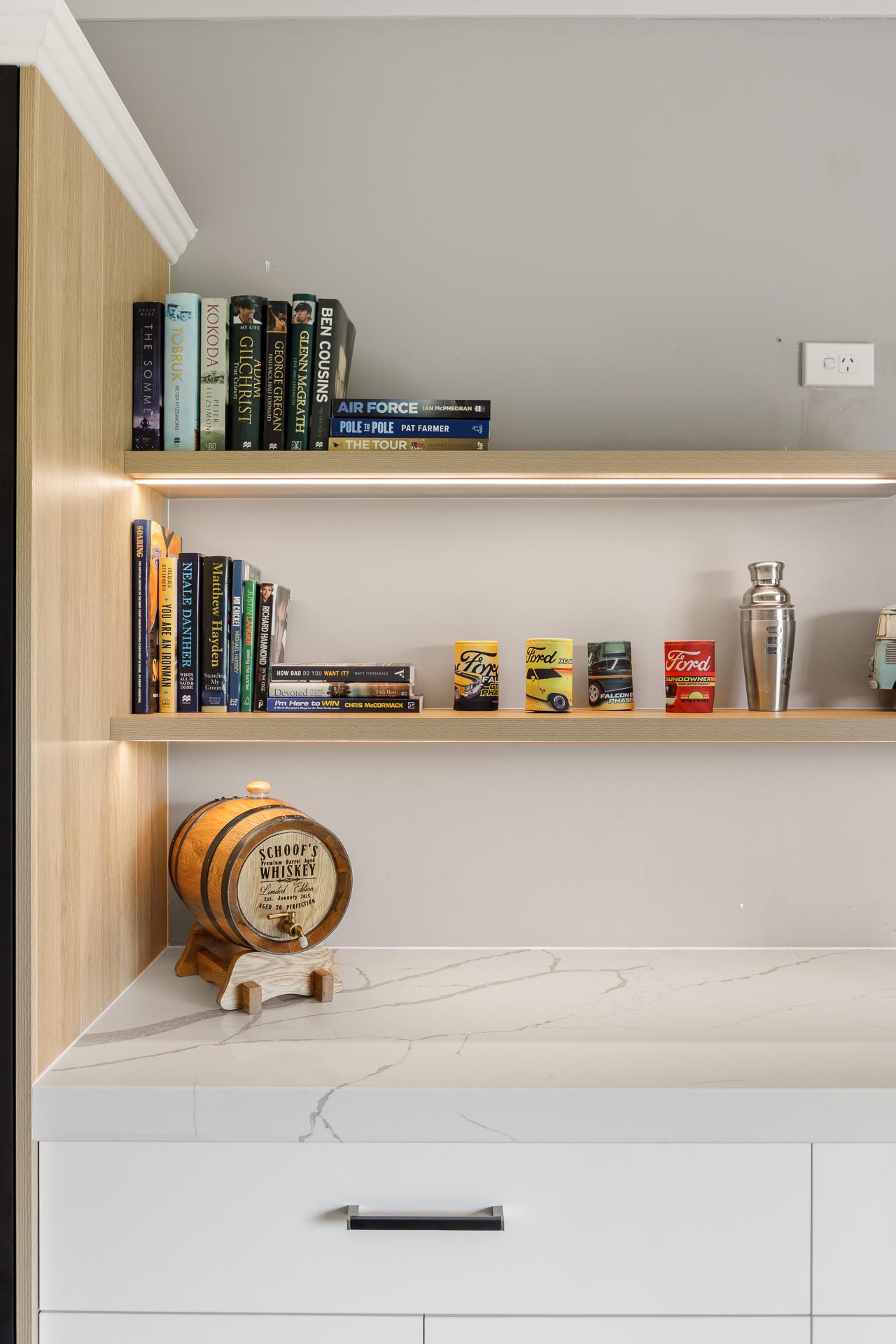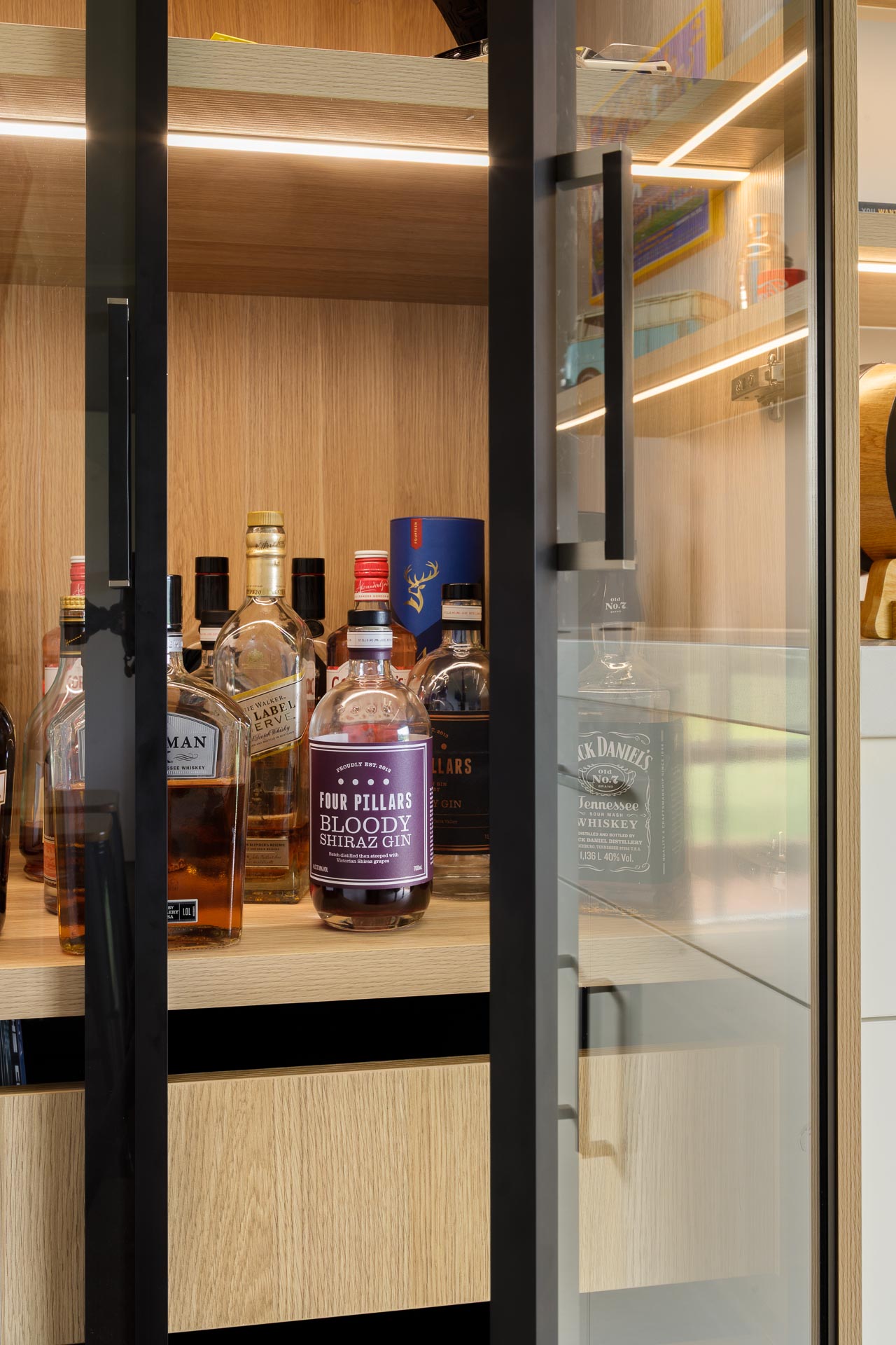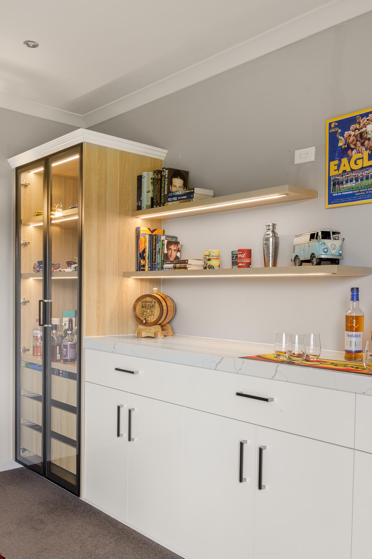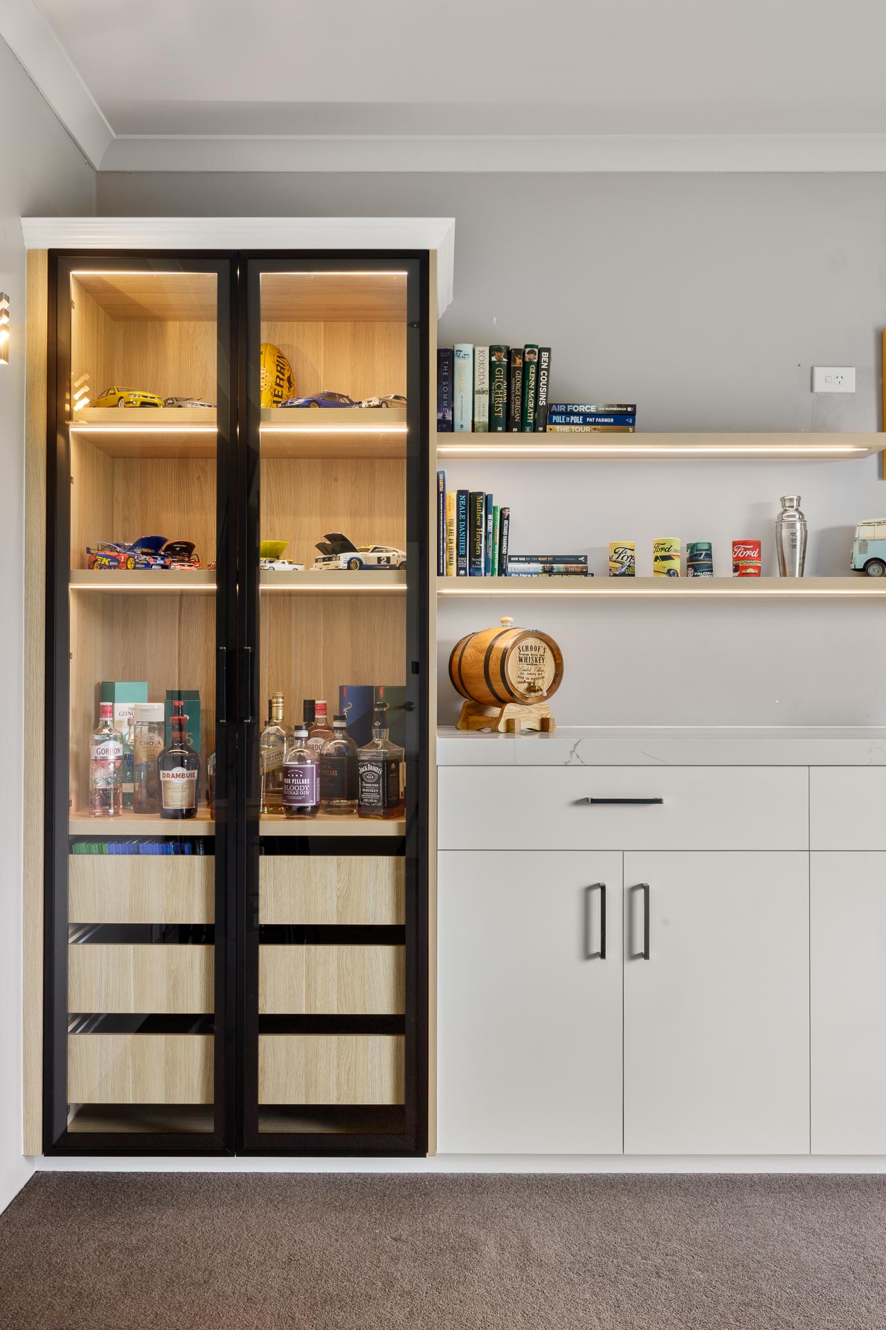 The challenge was to design custom cabinetry solutions that would seamlessly integrate with their home’s aesthetic while providing maximum functionality and storage. The entertainment unit needed to accommodate a 65″ TV and sound bar while offering concealed storage, and the games room required a full bar setup with wine storage, refrigeration space, and elegant display areas.