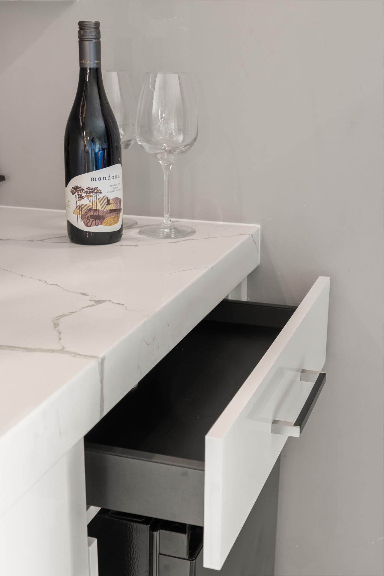 - Luxury Benchtop: 60mm QStone in Marmo Oro with 60mm fascia for a premium finish